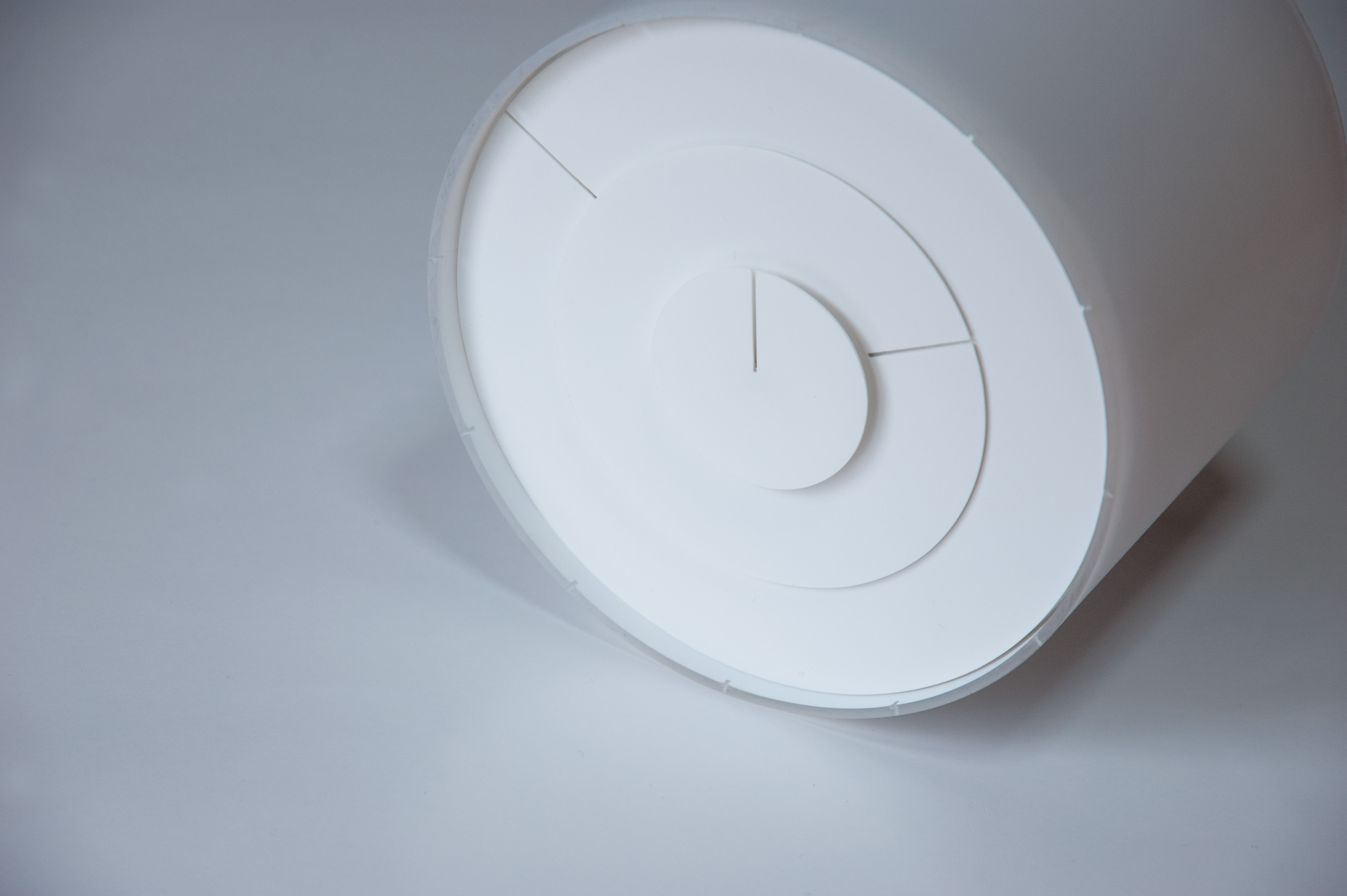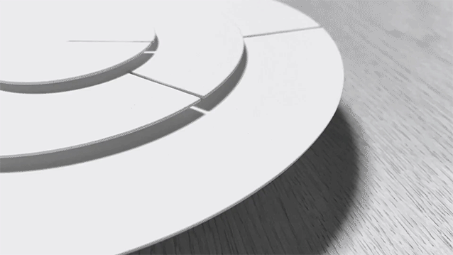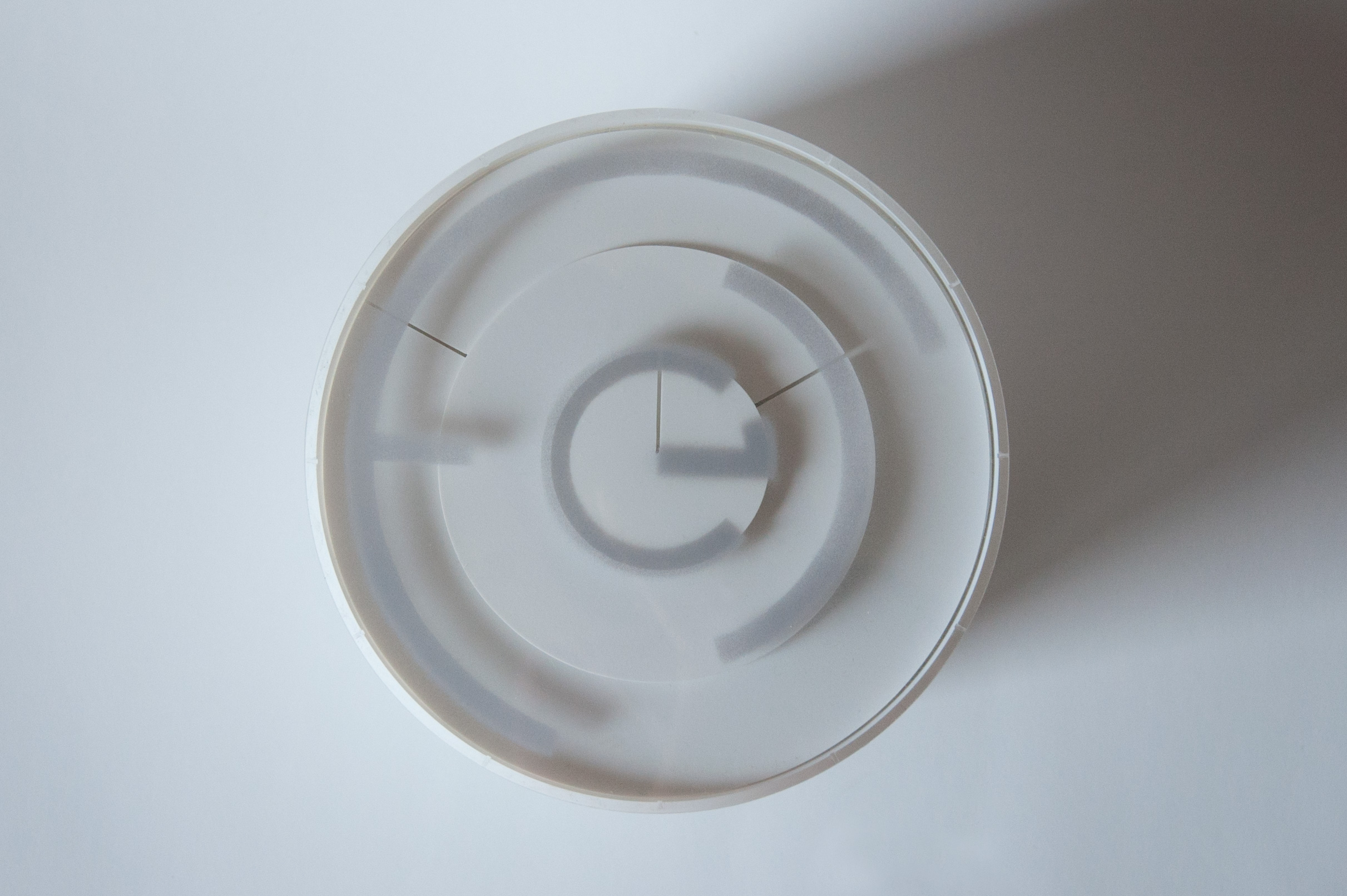 24時間のうちに24回、3つの円盤に切り込まれた線がぴったりと重なり、一直線の美しい線が生まれ、ふと時計を見たくなるだろう。