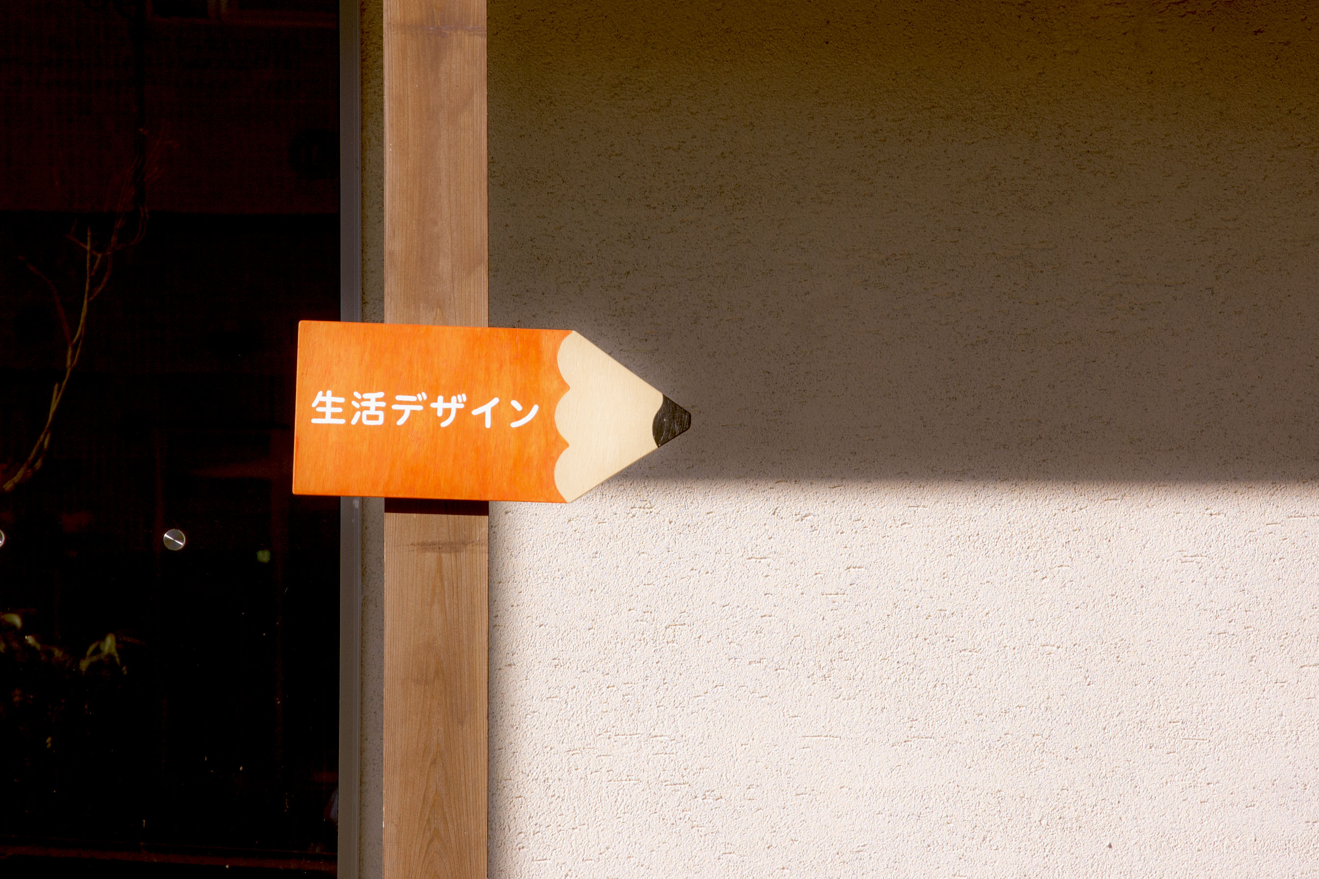 誘導のためのサインは、えんぴつのシルエットを矢印に見立て、感覚的に導けるようにした。