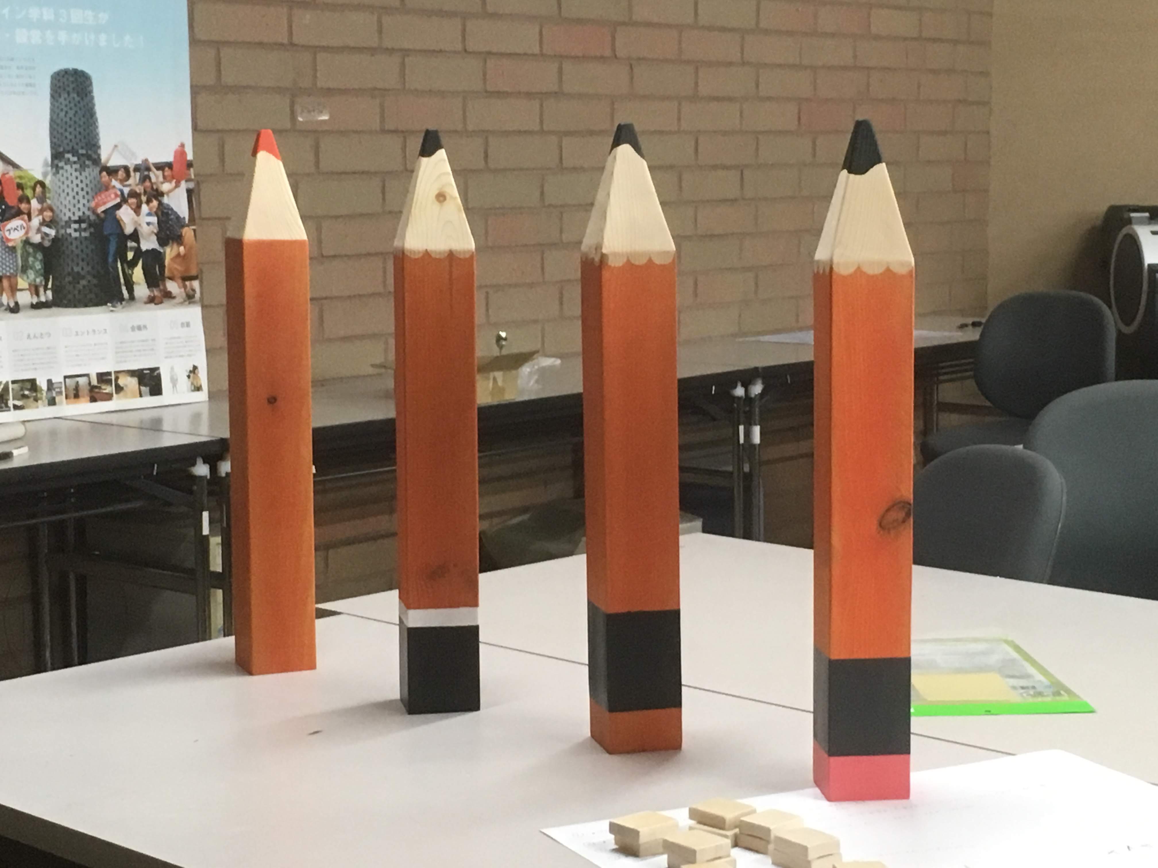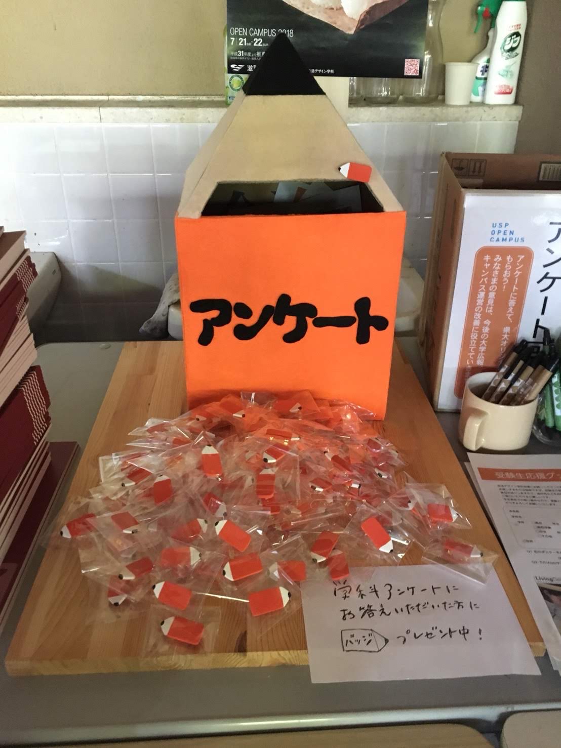 途中で、アンケートに答えてくれた学生に鉛筆型のバッジを配る案を思いつき、