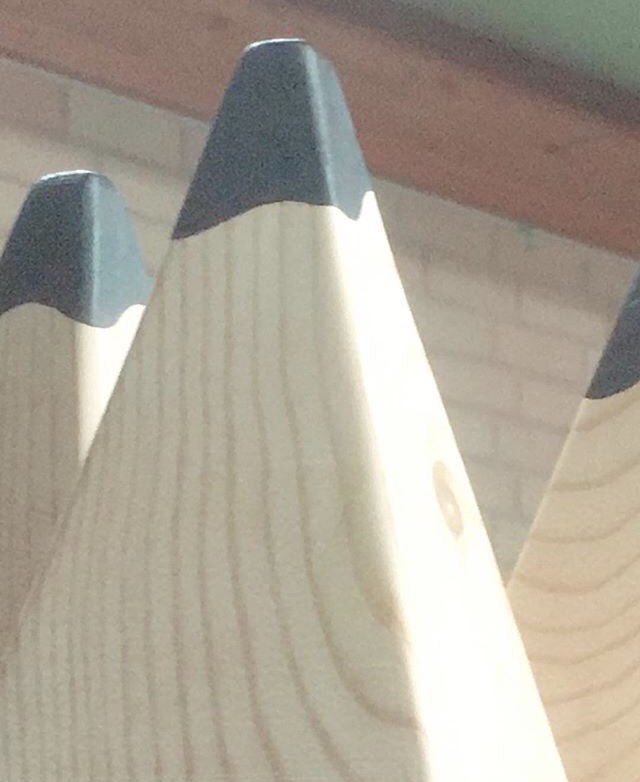 工学部の先生に頼み、角材の先を四角錐状に加工してもらい、紙やすりで丸みが出るようにやすることで鉛筆の芯らしさを再現した。