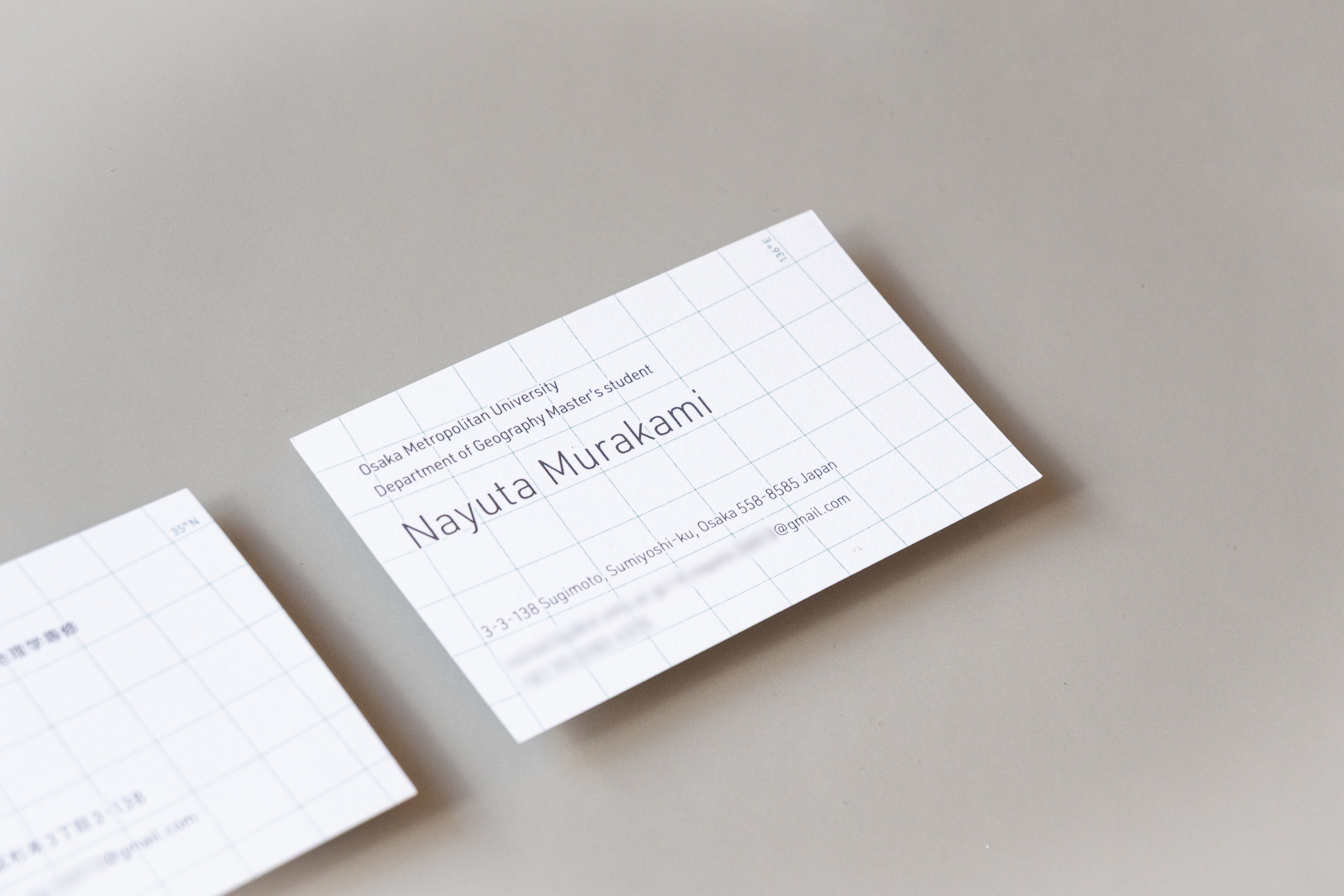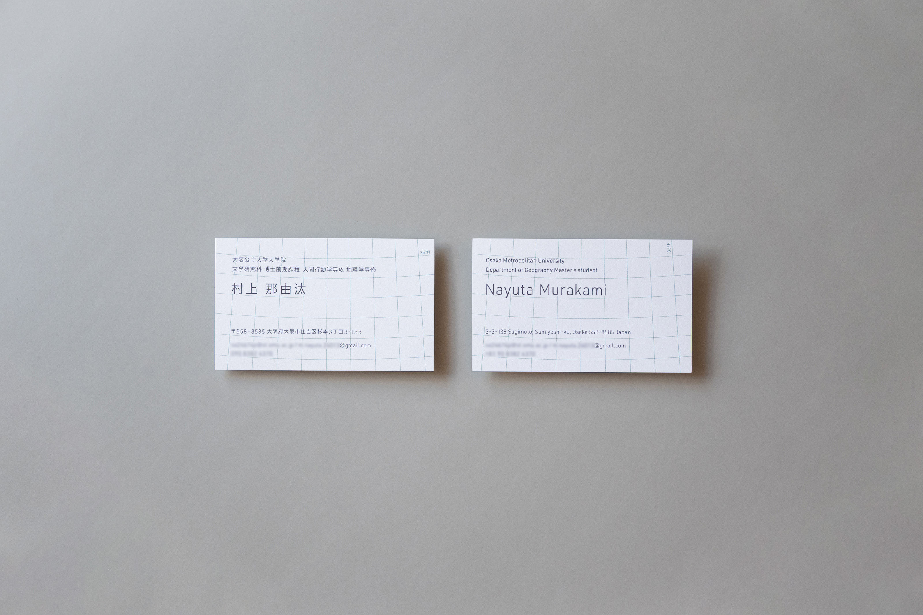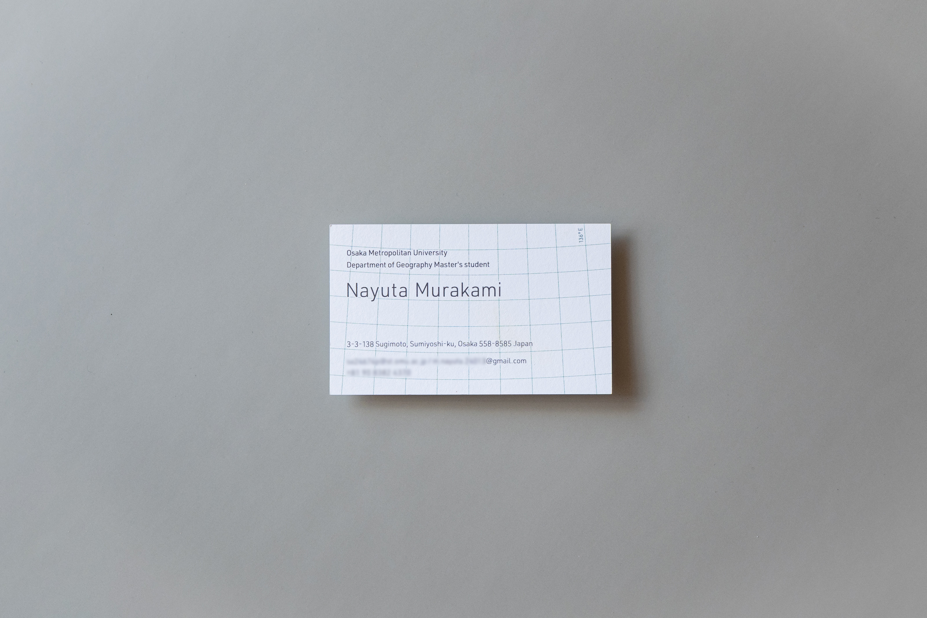 最終的には、一見格子柄に見えるラインが地図の緯線と緯線となっているデザインに決定した。 また、さりげなく示す緯度と経度は、彼の出身地である滋賀県・琵琶湖の「座標」となっている。 地理学を専攻し、全国を取材する可能性のある彼にとって、「滋賀出身なんです」という会話は多いのではないだろうかと想像した。名刺交換の時にそんなスモールトークが実際に行われたら嬉しい。