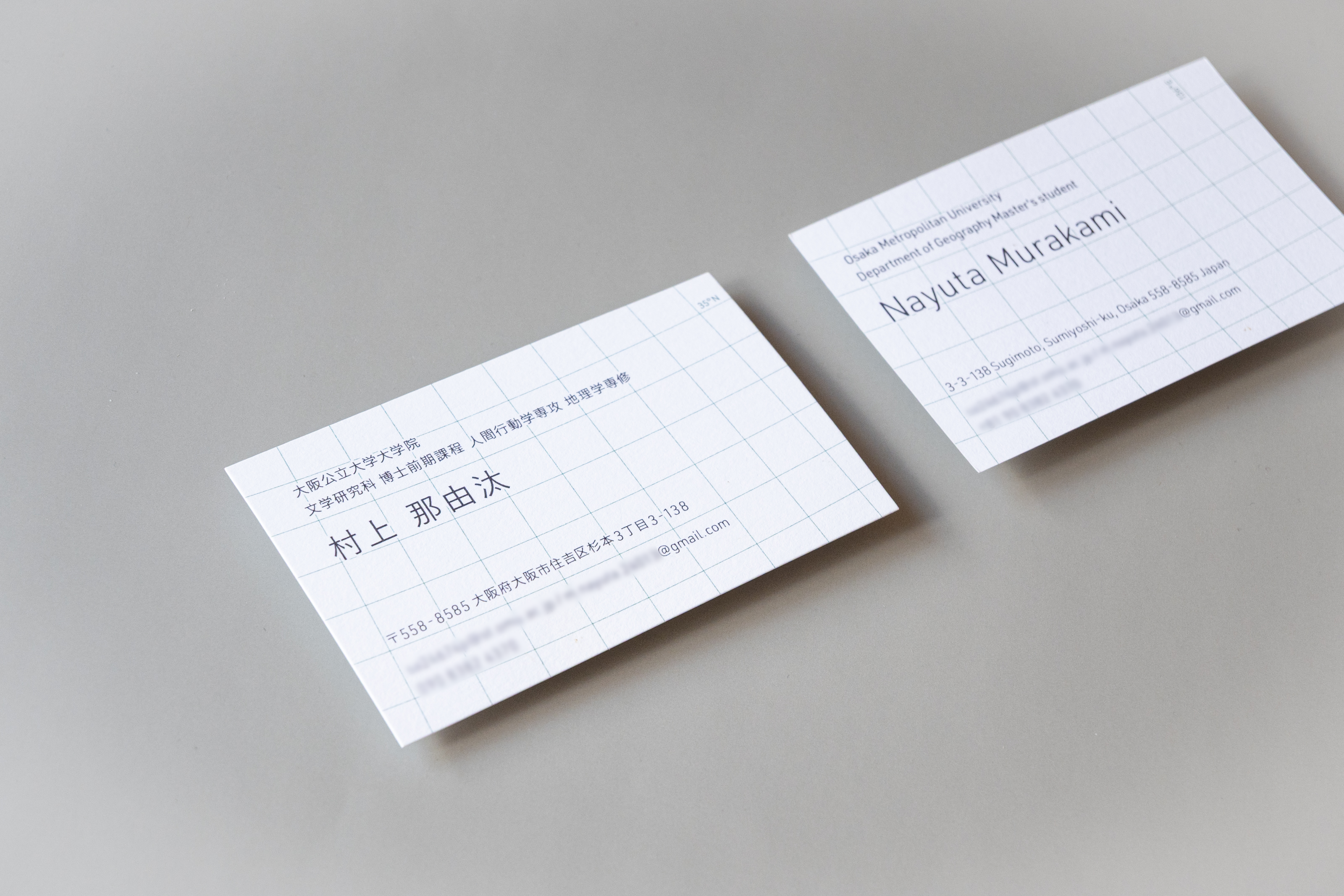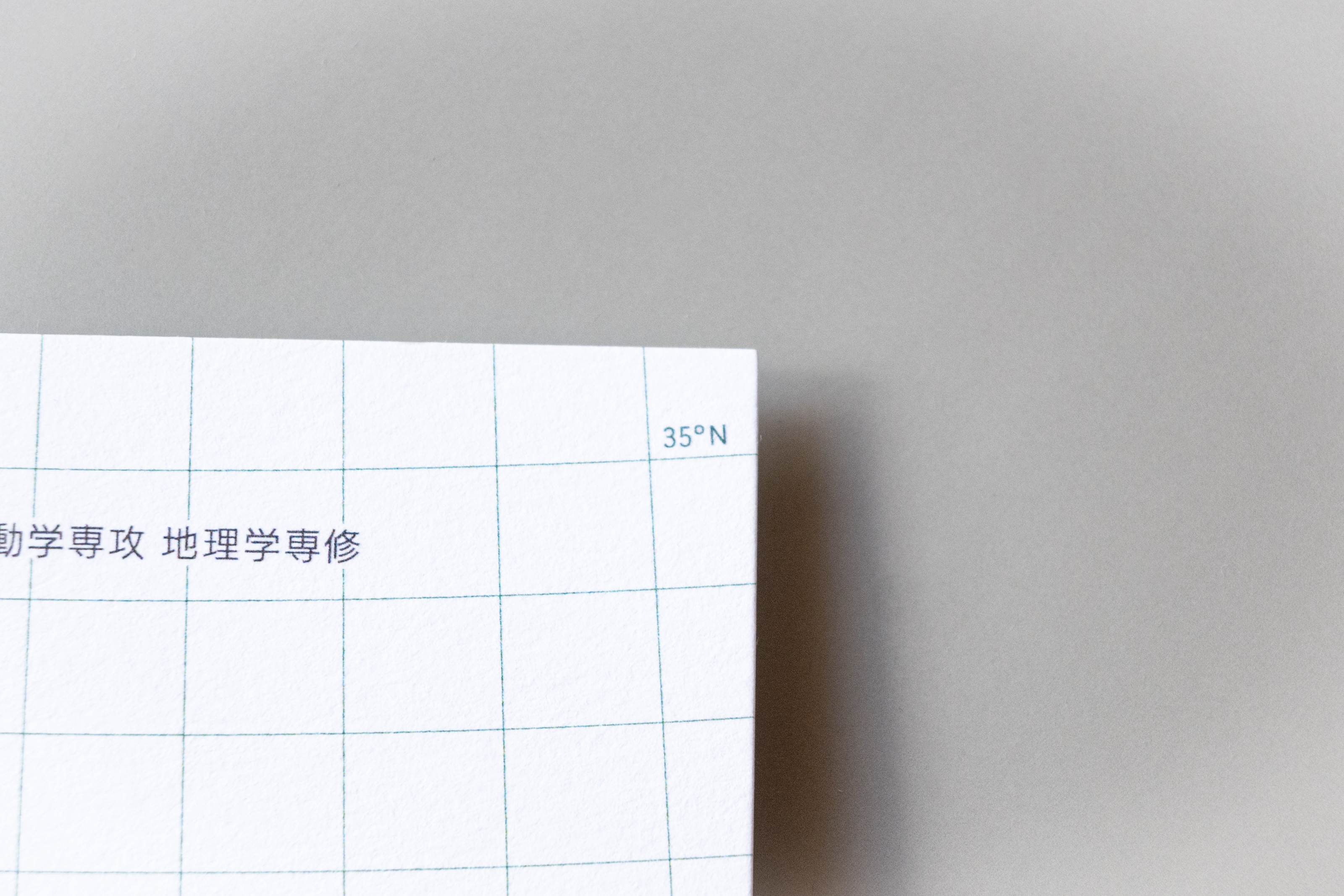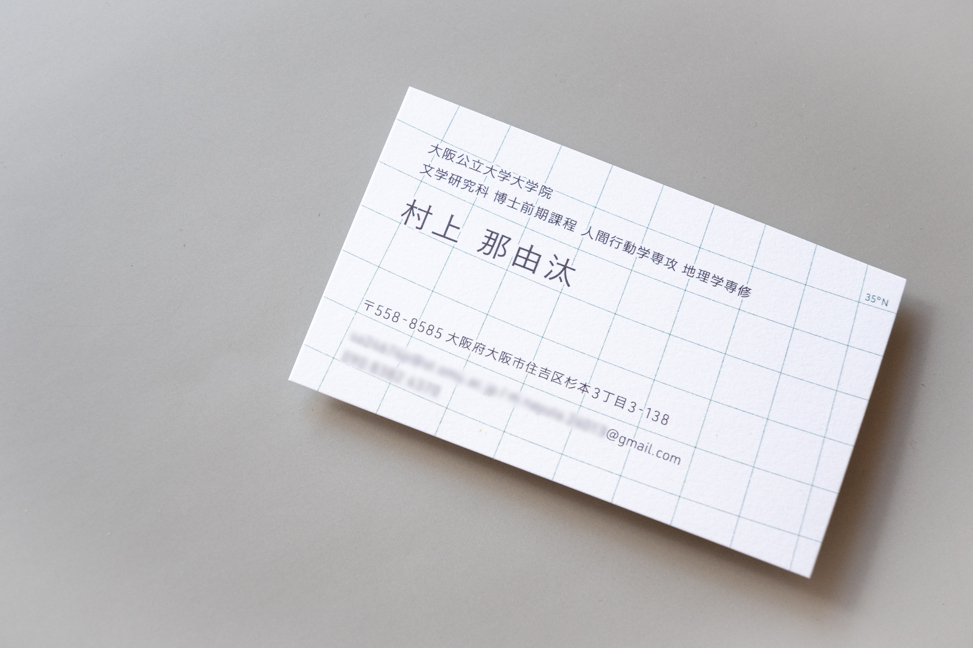 最終的には、一見格子柄に見えるラインが地図の緯線と緯線となっているデザインに決定した。 また、さりげなく示す緯度と経度は、彼の出身地である滋賀県・琵琶湖の「座標」となっている。 地理学を専攻し、全国を取材する可能性のある彼にとって、「滋賀出身なんです」という会話は多いのではないだろうかと想像した。名刺交換の時にそんなスモールトークが実際に行われたら嬉しい。