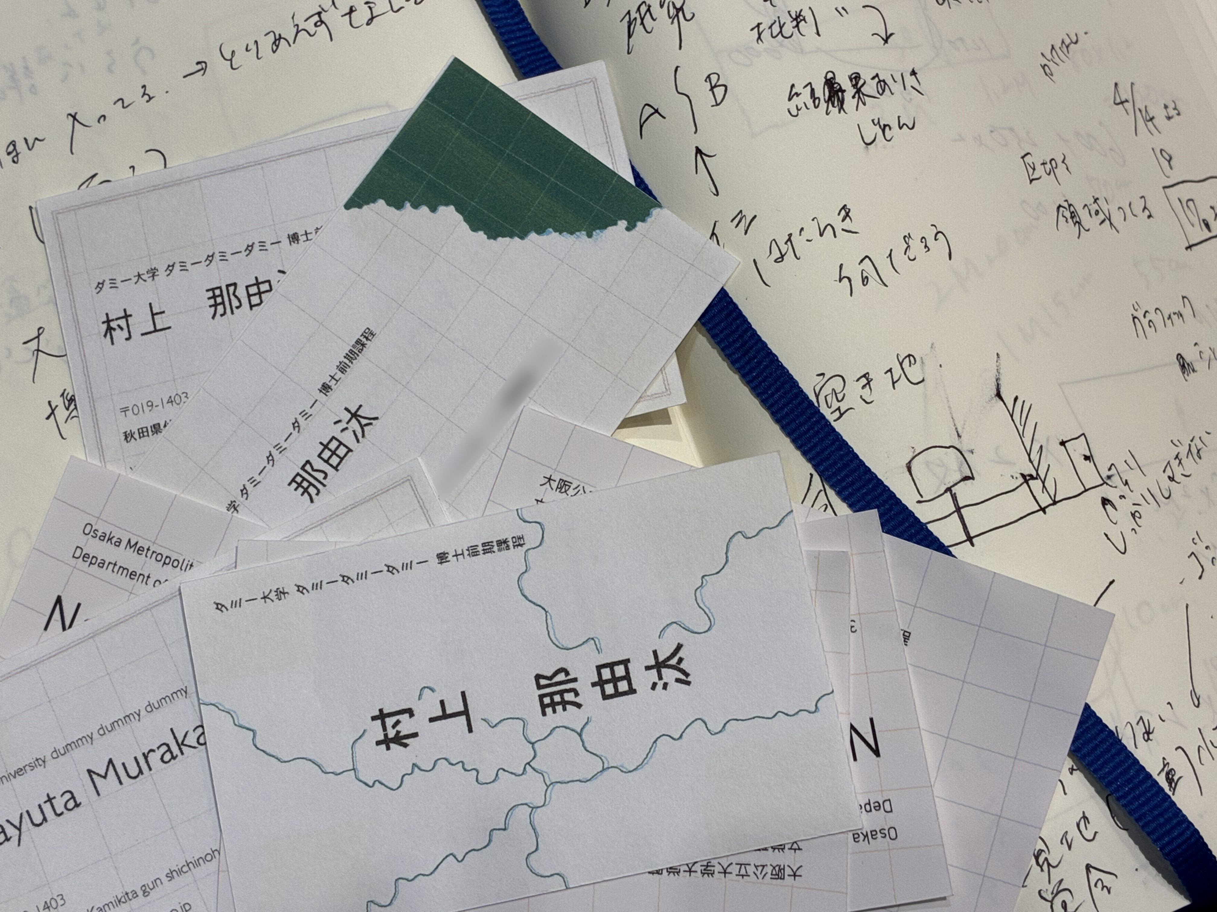 そこでキーワードとなった「境界/ボーダー」「地図」「地形」をうまく取り入れた名刺ができないか、と彼と話す中で決まっていった。 しかし、遊び心満載すぎても学会で浮いてしまうし、かといって真面目すぎても面白くない。 名刺交換時にちょっとした会話のきっかけとなるような、いいバランスを考えたいと思った。
